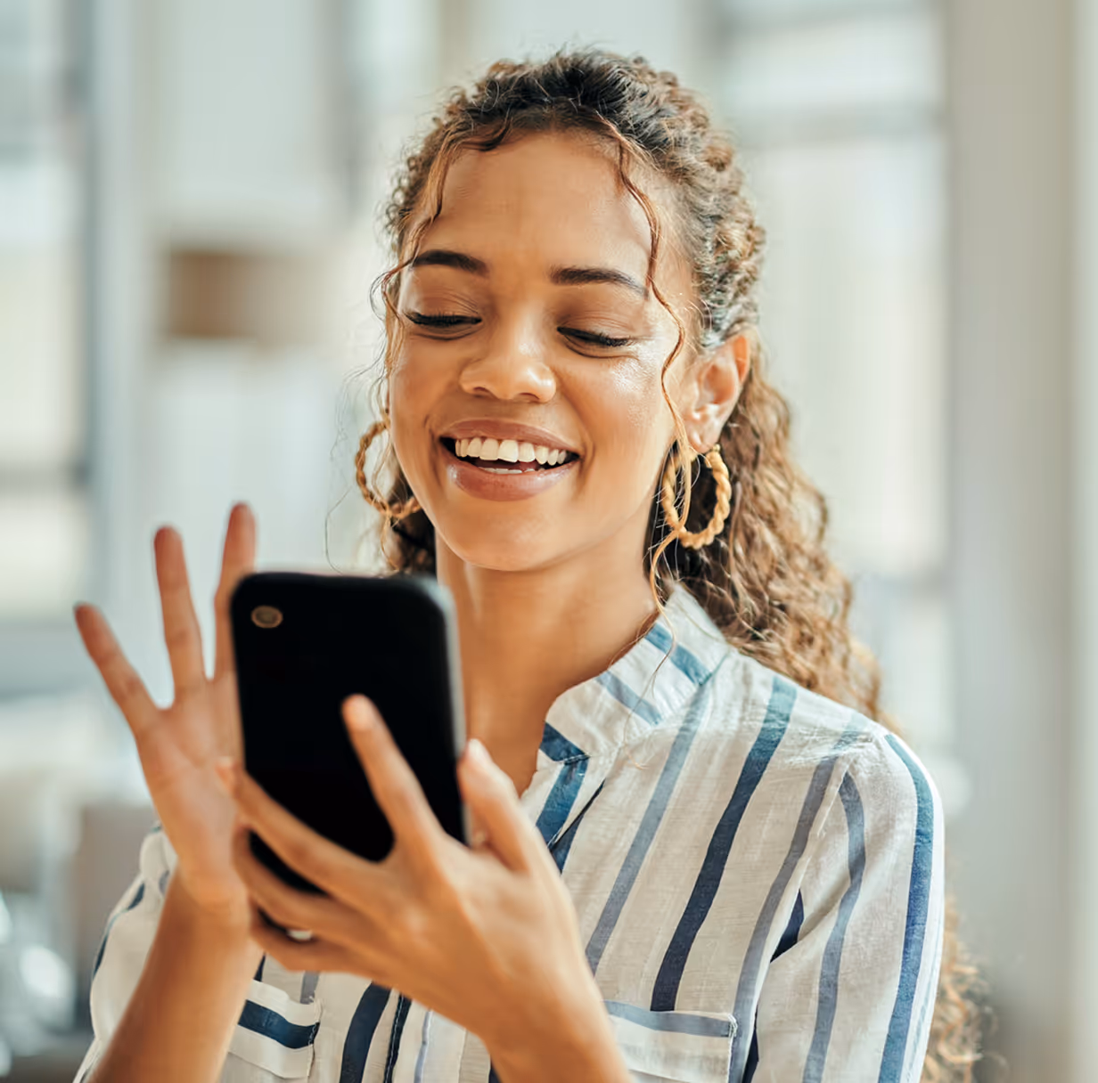 Smiling middle-aged woman with short hair using a smartphone, wearing a light denim jacket.